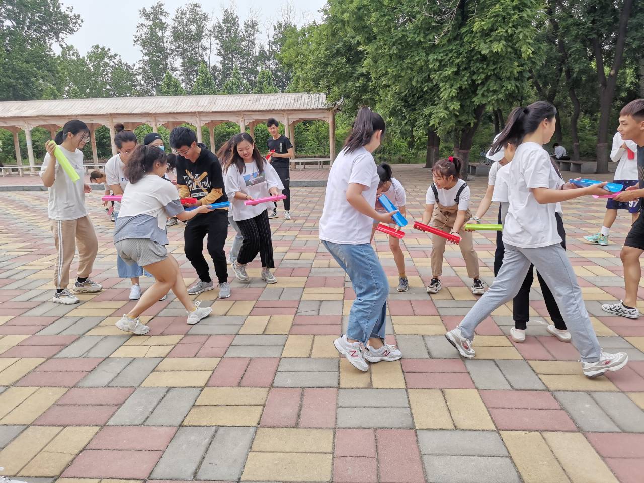 活动伊始,利用报数将同学们分成四组,分组完成后续项目。“珠行万里”游戏中,各小组队员一字排开,用弧形板运送圆珠,同时确保珠不落地,考验了各组员工的沟通协调能力。“齐眉棍”游戏中,同学们依据口令同时将塑料棍从腰间托举至齐眉,手指离开塑料棍者出局,考验了团队的配合统一能力。“无敌风火轮”游戏中,同学们用旧报纸做成环形带状“风火轮”,制作完成以后,3名组员进入“风火轮”,大家配合向前到达指定位置,同时确保风火轮不能破损,考验了团队的协调配合能力。每轮比赛结束后,各小组之间及时分享比赛感悟,在游戏中体会团队合作的道理。
