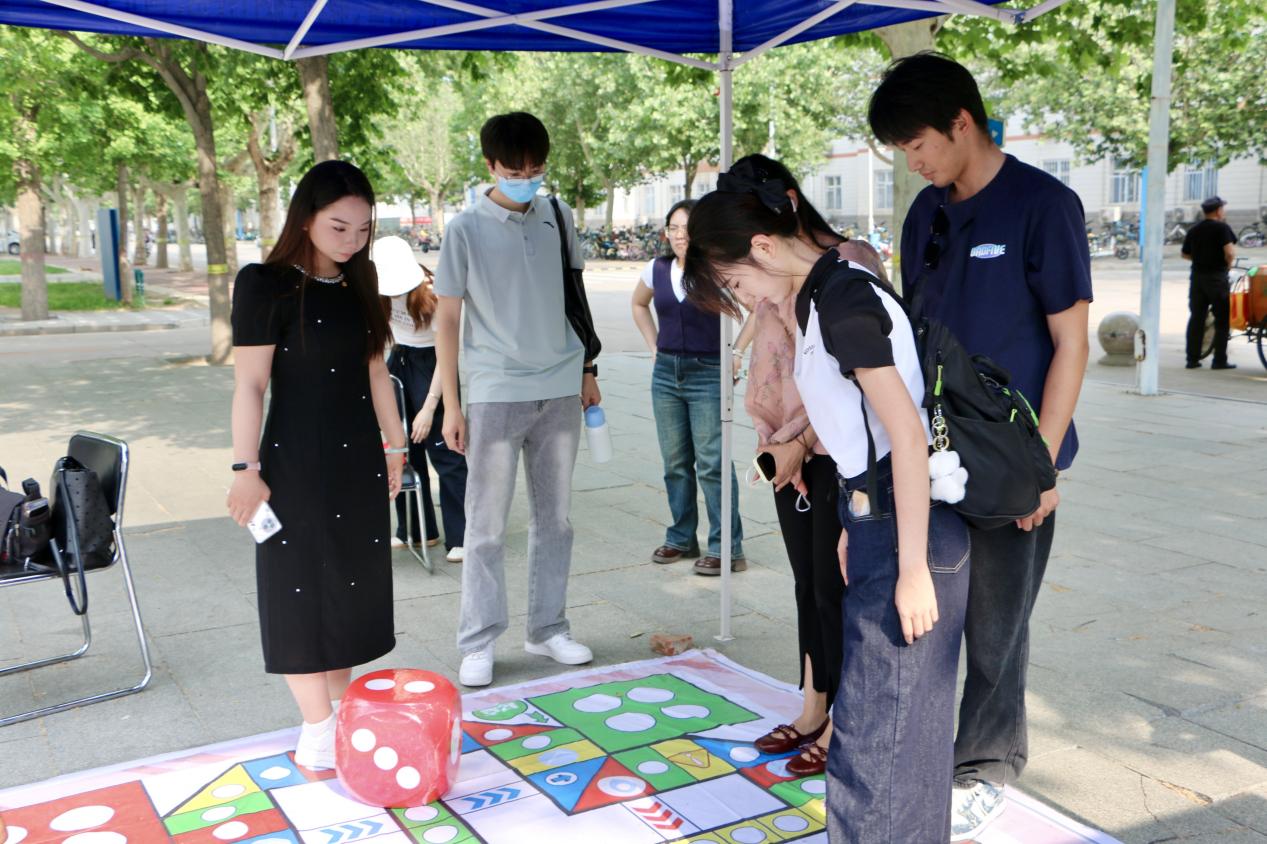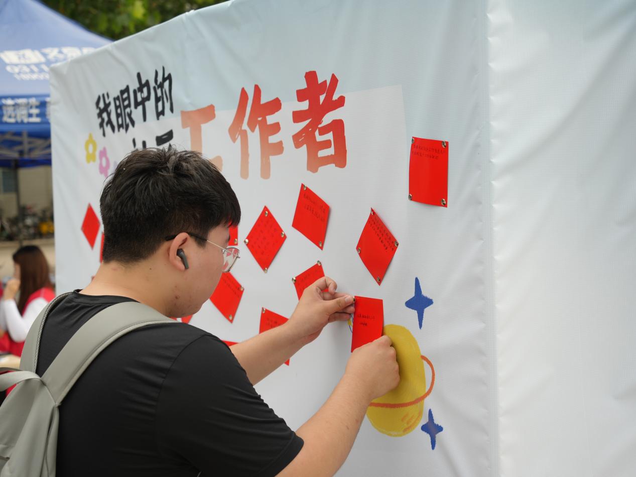 校园内设置了五大游戏体验区。在“社区故事风铃展”中同学们通过工作纪实卡片感知基层治理的温度;“垃圾分类大挑战”以趣味投篮互动的方式让同学们感受到社区工作者推进环保的用心;“爱心航线大冒险”和“公益大篷车物资捐赠”让同学们真正走进困境儿童的世界,为他们的生活出一份力;“银铃生活体验站”则通过负重障碍、关节束缚书写等模拟实验,让员工们切身感受老年群体的生活不便,增强对老龄化社会的理解与关怀。