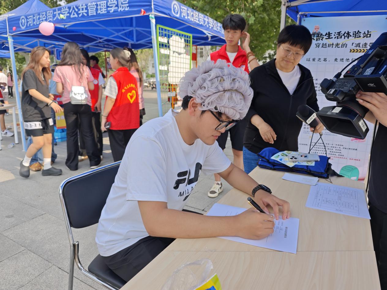 同学们通过双腿绑上沙袋跨越障碍赛道,用透明胶带缠绕手指关节后用笔填表等活动体验银龄生活,增强对老龄化社会的理解与关怀