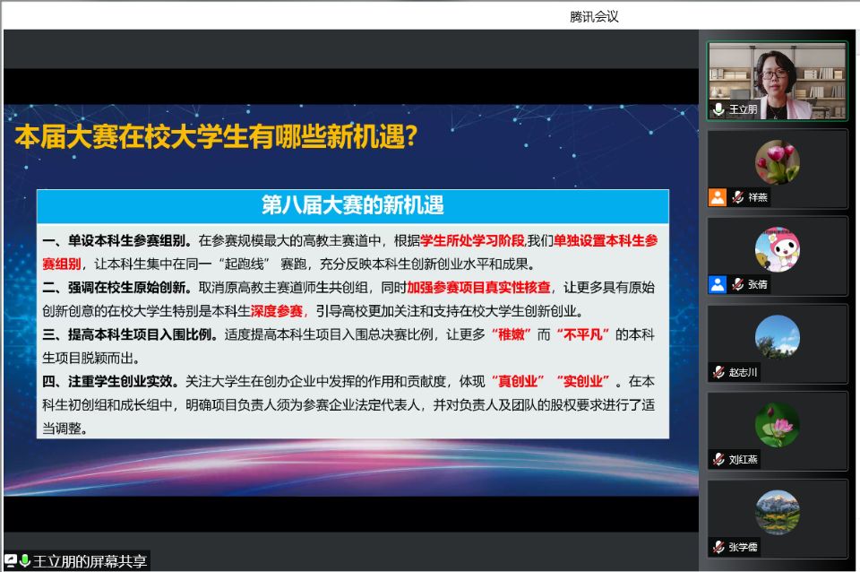 5月9日下午,公司举办“第八届中国国际‘互联网+’创新创业大赛政策解析与备赛技巧”讲座,讲座由公司党委副书记孟祥燕主持。公司邀请“互联网+”创新创业大赛的评审专家王立朋,以线上会议的方式对参会的近200名师生进行了赛前培训。