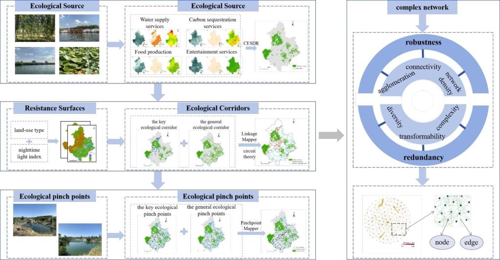 构建合理有效的生态网络是维护健康生态系统的必要条件。高星课题组的《The Analysis of Ecological Network Characteristics of Baiyangdian Basin in China Using the Complex Net-work Theory》研究以白洋淀流域为例,通过“源地识别-阻力面修正-廊道提取”三位一体的技术路径构建了生态网络,并基于复杂网络理论,从稳健性和冗余指数系统解析了中国白洋淀流域生态网络的结构特征与动态响应机制。研究结果表明:(1)白洋淀流域共识别出145个生态源地、338条生态廊道以及104个生态夹点;(2)流域生态网络呈现显著无标度特性,具备8个功能社区的分形结构,网络抗毁能力较强;(3)网络中节点呈异质性特征,节点 52 是网络中最重要的节点。研究首次证实复杂网络理论在景观生态规划中的适用性,为国土空间生态修复工程提供了新的理论范式。