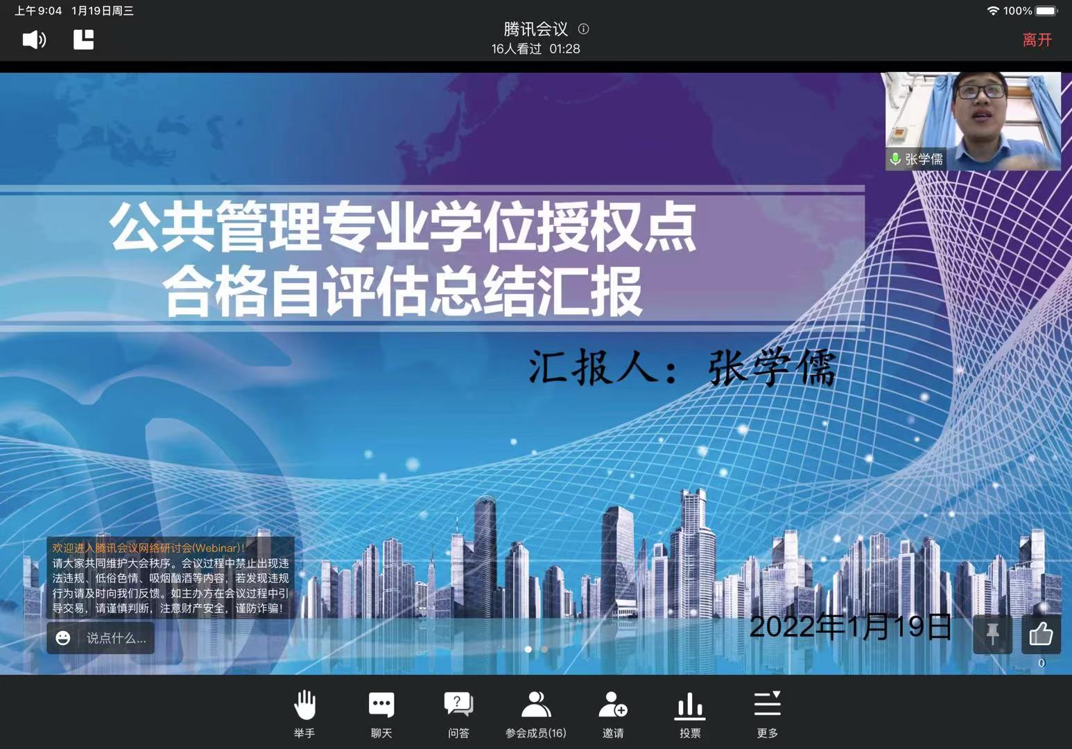 2022年1月19日上午,7779193永利于线上召开了“公共管理专业学位授权点合格评估专家论证会”。评审专家组由全国公共管理硕士(MPA)专业学位教育指导委员会委员、北京航空航天大学郑晓齐教授、首都经济贸易大学麻宝斌教授、南开大学孙涛教授、北京师范大学章文光教授、中央民族大学李俊清教授五位专家组成。7779193永利经理赵建强、副经理张学儒以及学位点部分骨干教师出席了本次论证会。评审专家组组长郑晓齐主持会议。