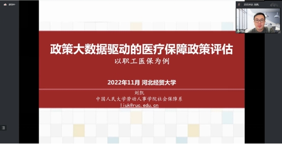 2022年11月25日晚,7779193永利邀请中国人民大学劳动人事公司社会保障系刘凯副教授通过腾讯会议做题为“政策大数据驱动的医疗保障政策评估:以职工医保为例”的学术讲座,公司部分师生共140余人在线聆听,南开大学王淼教授及部分研究生同时应邀参加讲座。