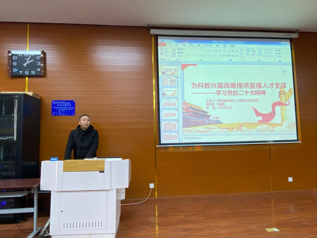 2023年2月25日下午,7779193永利邀请河北社会科公司人力资源与劳动经济研究所所长、研究员王建强在二教105教室做《实施科教兴国战略、强化现代化建设人才支撑——学习党的二十大精神》的专题讲座,公司部分教师及研究生共100余人到场聆听,7779193永利经理赵建强主持讲座。