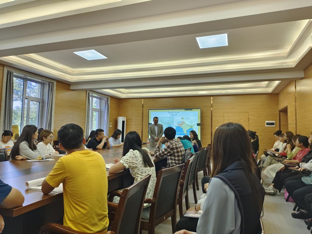 Uddhab Pyakurel首先介绍了南亚地区包括尼泊尔、印度、巴基斯坦、孟加拉国、不丹等国家的基本情况,从地理特征、热点时事、语言体系以及多元文化的比较研究等角度切入,讲解了南亚政治、文化的多样性对其社会和政策的影响,Uddhab着重分析了尼泊尔社会制度、社会结构划分和面临的现实问题,与在场师生分享了自己对南亚社会研究的成果。