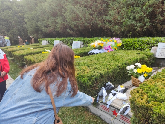 陵园内庄严肃穆,同学们跟随介绍人引领和讲解,先烈们“抛头颅、洒热血”的峥嵘岁月在场每个人的眼前重现。同学们肃立默哀三分钟,怀着崇敬的心情,郑重地向烈士纪念碑及长眠在此的革命先烈敬献了白菊。一朵白花,一次鞠躬,是对一个时代的缅怀,是对先烈的追思,是对未来的坚定,更是对来之不易生活的珍惜。全体团员在英烈墓前重温入团誓词,坚定报国之志。